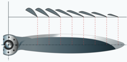 The tip of a propeller blade travels faster than the hub. Therefore, it is necessary for the blade to be twisted so as to decrease the angle of attack of the blade gradually and therefore produce uniform lift from the hub to the tip. The greatest angle of incidence, or the highest pitch, is at the hub while the smallest angle of incidence or smallest pitch is at the tip. A propeller blade designed with the same angle of incidence throughout its entire length would be inefficient because as airspeed increases in flight, the portion near the hub would have a negative AOA while the blade tip would be stalled.[31]