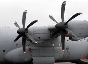 There have been efforts to develop propellers and propfans for aircraft at high subsonic speeds.[32] The 'fix' is similar to that of transonic wing design. Thin blade sections are used and the blades are swept back in a scimitar shape (scimitar propeller) in a manner similar to wing sweepback, so as to delay the onset of shockwaves as the blade tips approach the speed of sound. The maximum relative velocity is kept as low as possible by careful control of pitch to allow the blades to have large helix angles. A large number of blades are used to reduce work per blade and so circulation strength. Contra-rotating propellers are used. The propellers designed are more efficient than turbo-fans and their cruising speed (Mach 0.7–0.85) is suitable for airliners, but the noise generated is tremendous (see the Antonov An-70 and Tupolev Tu-95 for examples of such a design).