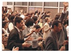 The last element of the gospel is that Jesus is the "Soon Coming King". For Pentecostals, "every moment is eschatological" since at any time Christ may return.[134] This "personal and imminent" Second Coming is for Pentecostals the motivation for practical Christian living including: personal holiness, meeting together for worship, faithful Christian service, and evangelism (both personal and worldwide).[135] Globally, Pentecostal attitudes to the End Times range from enthusiastic participation in the prophecy subculture to a complete lack of interest through to the more recent, optimistic belief in the coming restoration of God's kingdom.[136]