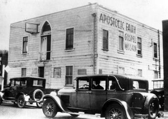 In 1905, Parham moved to Houston, Texas, where he started a Bible training school. One of his students was William J. Seymour, a one-eyed black preacher. Seymour traveled to Los Angeles where his preaching sparked the three-year-long Azusa Street Revival in 1906.[39] The revival first broke out on Monday April 9, 1906 at 214 Bonnie Brae Street and then moved to 312 Azusa Street on Friday, April 14, 1906.[40] Worship at the racially integrated Azusa Mission featured an absence of any order of service. People preached and testified as moved by the Spirit, spoke and sung in tongues, and fell in the Spirit. The revival attracted both religious and secular media attention, and thousands of visitors flocked to the mission, carrying the "fire" back to their home churches.[41] Despite the work of various Wesleyan groups such as Parham's and D. L. Moody's revivals, the beginning of the widespread Pentecostal movement in the US is generally considered to have begun with Seymour's Azusa Street Revival.[42]