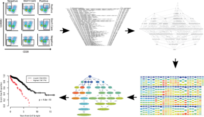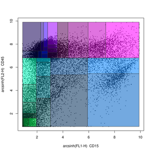 In a discovery setting, the goal is to identify and describe cell populations correlated with an external variable (as opposed to the diagnosis setting in which the goal is to combine the predictive power of multiple cell types to maximize the accuracy of the results). Similar to the diagnosis use-case, cluster matching in high-dimensional space can be used for exploratory analysis but the descriptive power of this approach is very limited, as it is hard to characterize and visualize a cell population in a high-dimensional space without first reducing the dimensionality.[56][58] Finally, combinatorial gating approaches have been particularly successful in exploratory analysis of FCM data. Simplified Presentation of Incredibly Complex Evaluations (SPICE) is a software package that can use the gating functionality of FlowJo to statistically evaluate a wide range of different cell populations and visualize those that are correlated with the external outcome. flowType and RchyOptimyx (as discussed above) expand this technique by adding the ability of exploring the impact of independent markers on the overall correlation with the external outcome. This enables the removal of unnecessary markers and provides a simple visualization of all identified cell types. In a recent analysis of a large (n=466) cohort of HIV+ patients, this pipeline identified three correlates of protection against HIV, only one of which had been previously identified through extensive manual analysis of the same dataset.[53]