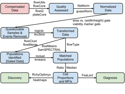 Much of the functionality of the Bioconductor packages for flow cytometry analysis has been packaged up for use with the GenePattern[71] workflow system, in the form of the GenePattern Flow Cytometry Suite.[72]