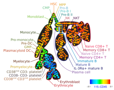 The number of scatter plots that need to be investigated increases with the square of the number of markers measured (or faster since some markers need to be investigated several times for each group of cells to resolve high-dimensional differences between cell types that appear to be similar in most markers).[36] To address this issue, principal component analysis has been used to summarize the high-dimensional datasets using a combination of markers that maximizes the variance of all data points.[37] However, PCA is a linear method and is not able to preserve complex and non-linear relationships. More recently, two dimensional minimum spanning tree layouts have been used to guide the manual gating process. Density-based down-sampling and clustering was used to better represent rare populations and control the time and memory complexity of the minimum spanning tree construction process.[38] More sophisticated dimension reduction algorithms are yet to be investigated.[39]