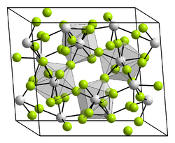 All four thorium tetrahalides are known, as are some low-valent bromides and iodides:[14] the tetrahalides are all hygroscopic compounds that dissolve easily in polar solvents such as water.[26] Additionally, many related polyhalide ions are also known.[14] Thorium tetrafluoride (ThF4, white, m.p. 1068 °C) is most easily produced by reacting various thorium salts, thoria, or thorium hydroxide with hydrogen fluoride: methods that involve steps in the aqueous phase are more difficult because they result in hydroxide and oxide fluorides that have to be reduced with hydrogen fluoride or fluorine gas.[14] It has a monoclinic crystal structure and is isotypic with zirconium tetrafluoride and hafnium tetrafluoride, where the Th4+ ions are coordinated with F− ions in somewhat distorted square antiprisms.[14] It is a white, hygroscopic powder: at temperatures above 500 °C, it reacts with atmospheric moisture to produce the oxyfluoride ThOF2.[27]