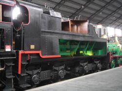 A primitive approach to condensation simply injected the spent steam into the tender tank, relying on the mass of water for cooling.[2] More sophisticated tenders, such as those used in the South African Railways Class 25 locomotives designed for service in the Karoo, replaced most of the water tank with a huge radiator, in which the steam was cooled and condensed. Exhaust steam, after passing through an oil-water separator, was conveyed to the tender, where it powered a low-pressure turbine used to drive the radiator fans. The steam then passed into the radiator. The condensate was injected into the boiler with another turbine-driven pump.[3] This was a quite complex bit of machinery, also requiring another turbine in the smokebox to provide the exhaust draft normally obtained by blowing the exhaust steam up the stack.[3] Eventually the SAR examples were converted to conventional locomotives by replacing the radiator with a long water tank.[4]