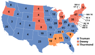 Truman was elected in 1948[9] in a surprise win over Republican Thomas Dewey, with both Strom Thurmond running as a Dixiecrat and FDR's second VP, Henry Wallace, running as a Progressive, garnering 303 electoral votes to Dewey's 189 and Thurmond's 39. His win is accredited to his plan to institute proposals from his Fair Deal