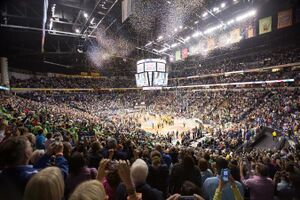 The term "final four" is most often used in the United States and in sports heavily influenced by that country; elsewhere, only the term "semi-finals" is in common use. Previously, it was believed that the phrase "final four" first appeared in print in a 1975 article for the Official Collegiate Basketball Guide, whose author Ed Chay was a sportswriter for the Cleveland Plain Dealer. Chay stated that the Marquette basketball team "was one of the final four" during the previous season's tournament. The myth that "final four" was first used in 1975 is refuted by the fact that the term "final four" was in widespread use in descriptions of the NCAA basketball tournament by the 1960s.[1] For example, Bill Mayer of the Kansas-based Lawrence Daily Journal World wrote in 1966, "What a great year it could be if ... KU ... could advance to the NCAA Final Four by winning the regional here."[2] The National Collegiate Athletic Association (NCAA) later trademarked the term.[3][4]