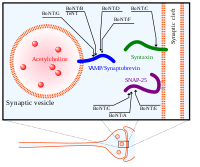 The most commonly used treatment for spasmodic torticollis is the use of botulinum toxin injection in the dystonic musculature. Botulinum toxin type A is most often used; it prevents the release of acetylcholine from the presynaptic axon of the motor end plate, paralyzing the dystonic muscle.[24] By disabling the movement of the antagonist muscle, the agonist muscle is allowed to move freely. With botulinum toxin injections, people experience relief from spasmodic torticollis for approximately 12 to 16 weeks.[20] There are several type A preparations available worldwide; however Botox and Dysport are the only preparations approved by the U.S. Food and Drug Administration (FDA) for clinical use in the United States.