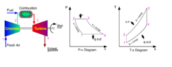 In an ideal gas turbine, gases undergo four thermodynamic processes: an isentropic compression, an isobaric (constant pressure) combustion, an isentropic expansion and heat rejection. Together, these make up the Brayton cycle.