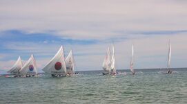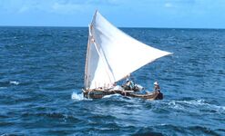 Crab-claw sails were invented by the Austronesians somewhere in Island Southeast Asia by at least 2000 BCE.[2] It spread with the Austronesian migration to Micronesia, Island Melanesia, Madagascar , and Polynesia. It may have also caused the unique development of outrigger boat technology due to the necessity for stability once crab claw sails were attached to small watercraft.[3] Crab claw sails can be used for double-canoe (catamaran), single-outrigger (on the windward side), or double-outrigger boat configurations, in addition to monohulls.[4][5]