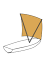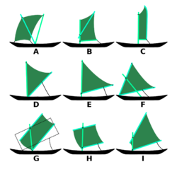 Crab claw sails are rigged fore-and-aft and can be tilted and rotated relative to the wind. They evolved from "V"-shaped perpendicular square sails (a "double sprit") in which the two spars converge at the base of the hull. The simplest form of the crab claw sail (also with the widest distribution) is composed of a triangular sail supported by two light spars (sometimes erroneously called "sprits") on each side. They were originally mastless, and the entire assembly was taken down when the sails were lowered.[3] There are several distinct types of crab claw rigs, but unlike western rigs, they do not have fixed conventional names.[6]
