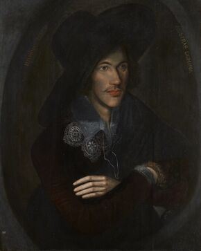 During his lifetime several likenesses were made of the poet. The earliest was the anonymous portrait of 1594 now in the National Portrait Gallery, London, which was restored in 2012.[31] One of the earliest Elizabethan portraits of an author, the fashionably dressed poet is shown darkly brooding on his love. The portrait was described in Donne's will as "that picture of myne wych is taken in the shaddowes", and bequeathed by him to Robert Kerr, 1st Earl of Ancram.[32] Other paintings include a 1616 head and shoulders after Isaac Oliver, also in the National Portrait Gallery,[33] and a 1622 head and shoulders in the Victoria and Albert Museum.[34] In 1911, the young Stanley Spencer devoted a visionary painting to John Donne arriving in heaven (1911) which is now in the Fitzwilliam Museum.[35]