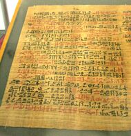 Egypt was also a center of alchemy research for much of the Mediterranean. Based on the medical papyri written in the 2500–1200 BCE, the ancient Egyptians believed that disease was mainly caused by the invasion of bodies by evil forces or spirits.[2] Thus, in addition to using medicines, their healing therapies included prayer, incantation, and ritual.[2] The Ebers Papyrus, written in around 1600 BCE, contains medical recipes for treating diseases related to the eyes, mouth, skin, internal organs, and extremities, as well as abscesses, wounds, burns, ulcers, swollen glands, tumors, headaches, and even bad breath. The Edwin Smith papyrus, written at about the same time, contains a surgical manual for treating wounds, fractures, and dislocations. The Egyptians believed that the effectiveness of their medicines depended on the preparation and administration under appropriate rituals.[2] Medical historians believe that ancient Egyptian pharmacology, for example, was largely ineffective.[49] Both the Ebers and Edwin Smith papyri applied the following components to the treatment of disease: examination, diagnosis, treatment, and prognosis,[50] which display strong parallels to the basic empirical method of science and, according to G.E.R. Lloyd,[51] played a significant role in the development of this methodology.