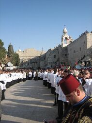 Christmas rites are held in Bethlehem on three different dates: December 25 is the traditional date by the Roman Catholic and Protestant denominations, but Greek, Coptic and Syrian Orthodox Christians celebrate Christmas on January 6 and Armenian Orthodox Christians on January 19. Most Christmas processions pass through Manger Square, the plaza outside the Basilica of the Nativity. Roman Catholic services take place in St. Catherine's Church and Protestants often hold services at Shepherds' Fields.[109]