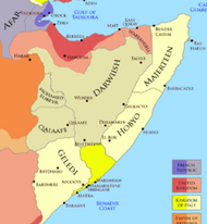 The Isaaq Sultanate was a Somali kingdom that ruled parts of the Horn of Africa during the 18th and 19th centuries. It spanned the territories of the Isaaq clan, descendants of the Banu Hashim clan,[53] in modern-day Somaliland and Ethiopia. The sultanate was governed by the Reer Guled branch of the Eidagale sub-clan established by the first sultan, Sultan Guled Abdi. The sultanate is the pre-colonial predecessor to the modern Somaliland.[54][55][56]