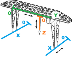 As shown on the right, a gantry crane is an overhead crane that is able to move its hook in 3 axes as indicated by the arrows. Intuitively, we can deduce that the crane should be a holonomic system as, for a given movement of its components, it doesn't matter what order or velocity the components move: as long as the total displacement of each component from a given starting condition is the same, all parts and the system as a whole will end up in the same state. Mathematically we can prove this as such: