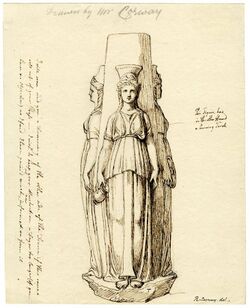 The 2nd-century travel writer Pausanias stated that Hecate was first depicted in triplicate by the sculptor Alcamenes in the Greek Classical period of the late 5th century BC,[3] whose sculpture was placed before the temple of the Wingless Nike in Athens. Though Alcamenes' original statue is lost, hundreds of copies exist, and the general motif of a triple Hecate situated around a central pole or column, known as a hekataion, was used both at crossroads shrines as well as at the entrances to temples and private homes. These typically depict her holding a variety of items, including torches, keys, serpents, and daggers.[26][25] Some hekataia, including a votive sculpture from Attica of the 3rd century BC, include additional dancing figures identified as the Charites circling the triple Hecate and her central column. It is possible that the representation of a triple Hecate surrounding a central pillar was originally derived from poles set up at three-way crossroads with masks hung on them, facing in each road direction. In the 1st century AD, Ovid wrote: "Look at Hecate, standing guard at the crossroads, one face looking in each direction."[25]