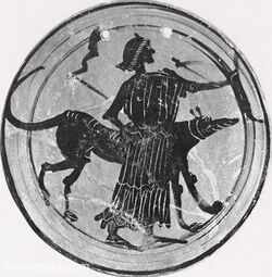Dogs were closely associated with Hecate in the Classical world. "In art and in literature Hecate is constantly represented as dog-shaped or as accompanied by a dog. Her approach was heralded by the howling of a dog. The dog was Hecate's regular sacrificial animal, and was often eaten in solemn sacrament."[28] The sacrifice of dogs to Hecate is attested for Thrace, Samothrace, Colophon, and Athens.[8] A 4th-century BCE marble relief from Crannon in Thessaly was dedicated by a race-horse owner.[29] It shows Hecate, with a hound beside her, placing a wreath on the head of a mare. It has been claimed that her association with dogs is "suggestive of her connection with birth, for the dog was sacred to Eileithyia, Genetyllis, and other birth goddesses. Images of her attended by a dog[30] are also found at times when she is shown as in her role as mother goddess with child, and when she is depicted alongside the god Hermes and the goddess Kybele in reliefs.[31] Although in later times Hecate's dog came to be thought of as a manifestation of restless souls or demons who accompanied her, its docile appearance and its accompaniment of a Hecate who looks completely friendly in many pieces of ancient art suggests that its original signification was positive and thus likelier to have arisen from the dog's connection with birth than the dog's underworld associations."[32] The association with dogs, particularly female dogs, could be explained by a metamorphosis myth in Lycophron: the friendly looking female dog accompanying Hecate was originally the Trojan Queen Hekabe, who leapt into the sea after the fall of Troy and was transformed by Hecate into her familiar.[33]