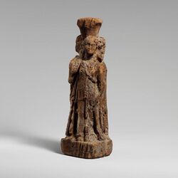 Hecate was generally represented as three-formed, though the earliest known images of the goddess are singular. Her earliest known representation is a small terracotta statue found in Athens. An inscription on the statue is a dedication to Hecate, in writing of the style of the 6th century, but it otherwise lacks any other symbols typically associated with the goddess. She is seated on a throne, with a chaplet around her head; the depiction is otherwise relatively generic.[24] Farnell states: "The evidence of the monuments as to the character and significance of Hecate is almost as full as that of to express her manifold and mystic nature."[24] A 6th century fragment of pottery from Boetia depicts a goddess which may be Hecate in a maternal or fertility mode. Crowned with leafy branches as in later descriptions, she is depicted offering a "maternal blessing" to two maidens who embrace her. The figure is flanked by lions, an animal associated with Hecate both in the Chaldean Oracles, coinage, and reliefs from Asia Minor.[25]