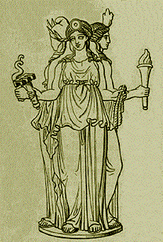 Hecate or Hekate (/ˈhɛkətiː/; Ancient Greek:, Hekátē) is a goddess in ancient Greek religion and mythology, most often shown holding a pair of torches or a key[1] and in later periods depicted in triple form. She is variously associated with crossroads, entrance-ways, light, magic, witchcraft, knowledge of herbs and poisonous plants, ghosts, necromancy, and sorcery.[2][3] She appears in the Homeric Hymn to Demeter and in Hesiod's Theogony, where she is promoted strongly as a great goddess. The place of origin of her following is uncertain, but it is thought that she had popular followings in Thrace.[4]