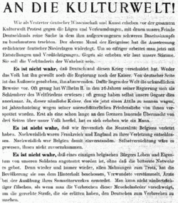 From Handwiki The "Manifesto of the Ninety-Three" (German: Manifest der 93; originally "To the Civilized World," An die Kulturwelt!, by "Professors of Germany") is a 4 October 1914[1] proclamation by 93 prominent Germans supporting Germany in the start of World War I. The Manifesto galvanized support for the war throughout German schools and universities, but many foreign intellectuals were outraged. For instance, some military actions by Germany were called elsewhere the Rape of Belgium.