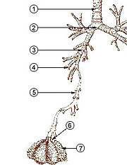 The respiratory system (also respiratory apparatus, ventilatory system) is a biological system consisting of specific organs and structures used for gas exchange in animals and plants. The anatomy and physiology that make this happen varies greatly, depending on the size of the organism, the environment in which it lives and its evolutionary history. In land animals the respiratory surface is internalized as linings of the lungs.[1] Gas exchange in the lungs occurs in millions of small air sacs called alveoli in mammals and reptiles, but atria in birds. These microscopic air sacs have a very rich blood supply, thus bringing the air into close contact with the blood.[2] These air sacs communicate with the external environment via a system of airways, or hollow tubes, of which the largest is the trachea, which branches in the middle of the chest into the two main bronchi. These enter the lungs where they branch into progressively narrower secondary and tertiary bronchi that branch into numerous smaller tubes, the bronchioles. In birds the bronchioles are termed parabronchi. It is the bronchioles, or parabronchi that generally open into the microscopic alveoli in mammals and atria in birds. Air has to be pumped from the environment into the alveoli or atria by the process of breathing which involves the muscles of respiration.