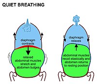 During exhalation the diaphragm and intercostal muscles relax. This returns the chest and abdomen to a position determined by their anatomical elasticity. This is the "resting mid-position" of the thorax and abdomen (Fig. 7) when the lungs contain their functional residual capacity of air (the light blue area in the right hand illustration of Fig. 7), which in the adult human has a volume of about 2.5–3.0 liters (Fig. 3).[6] Resting exhalation lasts about twice as long as inhalation because the diaphragm relaxes passively more gently than it contracts actively during inhalation.