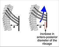 As the diaphragm contracts, the rib cage is simultaneously enlarged by the ribs being pulled upwards by the intercostal muscles as shown in Fig. 4. All the ribs slant downwards from the rear to the front (as shown in Fig. 4); but the lowermost ribs also slant downwards from the midline outwards (Fig. 5). Thus the rib cage's transverse diameter can be increased in the same way as the antero-posterior diameter is increase by the so-called pump handle movement shown in Fig. 4.