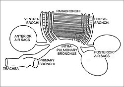 During inhalation air enters the trachea via the nostrils and mouth, and continues to just beyond the syrinx at which point the trachea branches into two primary bronchi, going to the two lungs (Fig. 16). The primary bronchi enter the lungs to become the intrapulmonary bronchi, which give off a set of parallel branches called ventrobronchi and, a little further on, an equivalent set of dorsobronchi (Fig. 16).[46] The ends of the intrapulmonary bronchi discharge air into the posterior air sacs at the caudal end of the bird. Each pair of dorso-ventrobronchi is connected by a large number of parallel microscopic air capillaries (or parabronchi) where gas exchange occurs (Fig. 16).[46] As the bird inhales, tracheal air flows through the intrapulmonary bronchi into the posterior air sacs, as well as into the dorsobronchi, but not into the ventrobronchi (Fig. 18). This is due to the bronchial architecture which directs the inhaled air away from the openings of the ventrobronchi, into the continuation of the intrapulmonary bronchus towards the dorsobronchi and posterior air sacs.[50][51][52] From the dorsobronchi the inhaled air flows through the parabronchi (and therefore the gas exchanger) to the ventrobronchi from where the air can only escape into the expanding anterior air sacs. So, during inhalation, both the posterior and anterior air sacs expand,[46] the posterior air sacs filling with fresh inhaled air, while the anterior air sacs fill with "spent" (oxygen-poor) air that has just passed through the lungs.