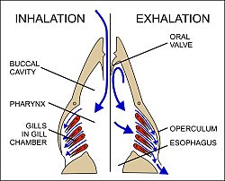 Water is drawn in through the mouth by closing the operculum (gill cover), and enlarging the mouth cavity (Fig. 23). Simultaneously the gill chambers enlarge, producing a lower pressure there than in the mouth causing water to flow over the gills.[58] The mouth cavity then contracts inducing the closure of the passive oral valves, thereby preventing the back-flow of water from the mouth (Fig. 23).[58][65] The water in the mouth is, instead, forced over the gills, while the gill chambers contract emptying the water they contain through the opercular openings (Fig. 23). Back-flow into the gill chamber during the inhalatory phase is prevented by a membrane along the ventroposterior border of the operculum (diagram on the left in Fig. 23). Thus the mouth cavity and gill chambers act alternately as suction pump and pressure pump to maintain a steady flow of water over the gills in one direction.[58] Since the blood in the lamellar capillaries flows in the opposite direction to that of the water, the consequent countercurrent flow of blood and water maintains steep concentration gradients for oxygen and carbon dioxide along the entire length of each capillary (lower diagram in Fig. 22). Oxygen is, therefore, able to continually diffuse down its gradient into the blood, and the carbon dioxide down its gradient into the water.[57] Although countercurrent exchange systems theoretically allow an almost complete transfer of a respiratory gas from one side of the exchanger to the other, in fish less than 80% of the oxygen in the water flowing over the gills is generally transferred to the blood.[56]