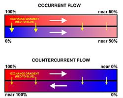 Gills use a countercurrent exchange system that increases the efficiency of oxygen-uptake from the water.[56][57][58] Fresh oxygenated water taken in through the mouth is uninterruptedly "pumped" through the gills in one direction, while the blood in the lamellae flows in the opposite direction, creating the countercurrent blood and water flow (Fig. 22), on which the fish's survival depends.[58]