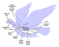 The respiratory system of birds differs significantly from that found in mammals. Firstly, they have rigid lungs which do not expand and contract during the breathing cycle. Instead an extensive system of air sacs (Fig. 15) distributed throughout their bodies act as the bellows drawing environmental air into the sacs, and expelling the spent air after it has passed through the lungs (Fig. 18).[44] Birds also do not have diaphragms or pleural cavities.