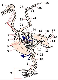 Inhalation and exhalation are brought about by alternately increasing and decreasing the volume of the entire thoraco-abdominal cavity (or coelom) using both their abdominal and costal muscles.[46][47][48] During inhalation the muscles attached to the vertebral ribs (Fig. 17) contract angling them forwards and outwards. This pushes the sternal ribs, to which they are attached at almost right angles, downwards and forwards, taking the sternum (with its prominent keel) in the same direction (Fig. 17). This increases both the vertical and transverse diameters of thoracic portion of the trunk. The forward and downward movement of, particularly, the posterior end of the sternum pulls the abdominal wall downwards, increasing the volume of that region of the trunk as well.[46] The increase in volume of the entire trunk cavity reduces the air pressure in all the thoraco-abdominal air sacs, causing them to fill with air as described below.