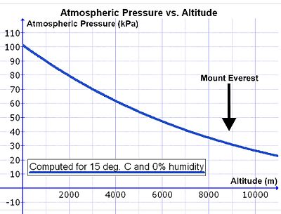 A further minor complication exists at altitude. If the volume of the lungs were to be instantaneously doubled at the beginning of inhalation, the air pressure inside the lungs would be halved. This happens regardless of altitude. Thus, halving of the sea level air pressure (100 kPa) results in an intrapulmonary air pressure of 50 kPa. Doing the same at 5500 m, where the atmospheric pressure is only 50 kPa, the intrapulmonary air pressure falls to 25 kPa. Therefore, the same change in lung volume at sea level results in a 50 kPa difference in pressure between the ambient air and the intrapulmonary air, whereas it result in a difference of only 25 kPa at 5500 m. The driving pressure forcing air into the lungs during inhalation is therefore halved at this altitude. The rate of inflow of air into the lungs during inhalation at sea level is therefore twice that which occurs at 5500 m. However, in reality, inhalation and exhalation occur far more gently and less abruptly than in the example given. The differences between the atmospheric and intrapulmonary pressures, driving air in and out of the lungs during the breathing cycle, are in the region of only 2–3 kPa.[18][19] A doubling or more of these small pressure differences could be achieved only by very major changes in the breathing effort at high altitudes.