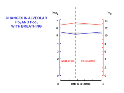 The volume of air that moves in or out (at the nose or mouth) during a single breathing cycle is called the tidal volume. In a resting adult human it is about 500 ml per breath. At the end of exhalation the airways contain about 150 ml of alveolar air which is the first air that is breathed back into the alveoli during inhalation.[10][20] This volume air that is breathed out of the alveoli and back in again is known as dead space ventilation, which has the consequence that of the 500 ml breathed into the alveoli with each breath only 350 ml (500 ml - 150 ml = 350 ml) is fresh warm and moistened air.[6] Since this 350 ml of fresh air is thoroughly mixed and diluted by the air that remains in the alveoli after normal exhalation (i.e. the functional residual capacity of about 2.5–3.0 liters), it is clear that the composition of the alveolar air changes very little during the breathing cycle (see Fig. 9). The oxygen tension (or partial pressure) remains close to 13-14 kPa (about 100 mm Hg), and that of carbon dioxide very close to 5.3 kPa (or 40 mm Hg). This contrasts with composition of the dry outside air at sea level, where the partial pressure of oxygen is 21 kPa (or 160 mm Hg) and that of carbon dioxide 0.04 kPa (or 0.3 mmHg).[6]