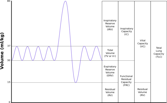 The lungs expand and contract during the breathing cycle, drawing air in and out of the lungs. The volume of air moved in or out of the lungs under normal resting circumstances (the resting tidal volume of about 500 ml), and volumes moved during maximally forced inhalation and maximally forced exhalation are measured in humans by spirometry.[12] A typical adult human spirogram with the names given to the various excursions in volume the lungs can undergo is illustrated below (Fig. 3):