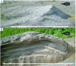 These deposits are often found at the base of pyroclastic flows. They are thinly bedded, laminated and often cross-bedded.[6] Typically they are about 1 m. thick and consist mostly of lithic and crystal fragments (fine ash elutriated away). They appear to form from the flow itself, but the mechanism is not clear. One possibility is that the head of the flow expands through entrainment of air (which is then heated). This then results in the flow front surging forward, which is then over-run by the rest of the flow.[5]