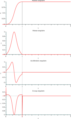 The figure shows the motion curves for an external four-slot Geneva drive, in arbitrary units. A discontinuity appears in the acceleration when the drive pin enters and leaves the slot, occurring at the instant the rigid bearing surfaces make contact or separate. This generates an "infinite" peak of jerk (Dirac peak), and therefore vibrations.[3]:127