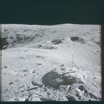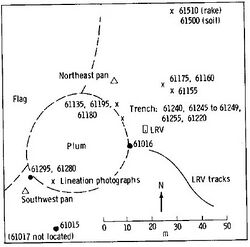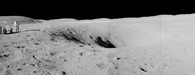 Flag crater is approximately 240 m in diameter and over 20 m deep.[2] The adjacent crater Plum is only about 30 m in diameter.[3] The slightly larger crater Spook, also visited by the astronauts, lies less than 1 km to the east.