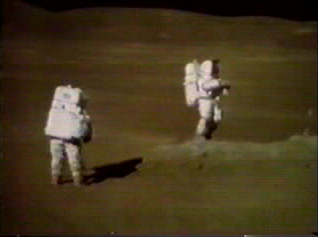 TV camera still of Duke (left) and Young on the rim of Plum. Duke remarked at this time, "John, you are just beautiful. That is the most beautiful sight." Young is standing next to a boulder from which sample 61295 was taken.