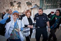 On October 16, 2012, Hoffman was arrested again. She was accused of singing out loud and disturbing the peace, and was released from police custody the following day.[96] The following morning Lesley Sachs and board member Rachel Cohen Yeshurun were detained for "disturbing public order."[97] Hoffman described the ordeal: "In the past when I was detained I had to have a policewoman come with me to the bathroom, but this was something different. This time they checked me naked, completely, without my underwear. They dragged me on the floor 15 meters; my arms are bruised. They put me in a cell without a bed, with three other prisoners, including a prostitute and a car thief. They threw the food through a little window in the door. I laid on the floor covered with my tallit. I'm a tough cookie, but I was just so miserable. And for what? I was with the Hadassah women saying Sh'ma Yisrael."[98]