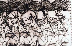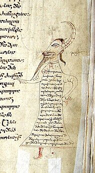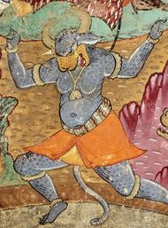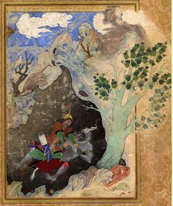 According to Abu Ali Bal'ami's work on the history of the world, Wahb ibn Munabbih explained that the divs were the first beings created by God.[109] Some argue the devils were created good, but turned evil by Iblis' act of arrogance, the div were created as vicious creatures and embodiment of evil.[110][111] When Iblis was still among the angels, he led an army against the spirits on the earth. Among them were the div, who formed two orders; one of which sided with the jinn and were banished with them, condemned to roam the earth. The other, treacherous div joined Iblis in battle, and was exiled to Hell with him. The div are often depicted as sorcerers whose misdeeds are not bound to temptation only. They could cause sickness, mental illnesses, or even turn humans to stone by touching.[112] While the devils frequently appear to ordinary humans to tempt them into everything disapproved by society, the div usually appear to specific heroes.[113][114]