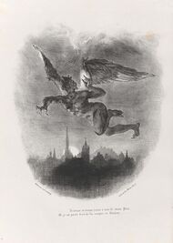 Demons may or may not also be considered to be devils: minions of the Devil.[1] In many traditions, demons are independent operators, with different demons causing different types of evils (destructive natural phenomena, specific diseases, etc.). In religions featuring a principal Devil (e.g. Satan) locked in an eternal struggle with God, demons are often also thought to be subordinates of the principal Devil. As lesser spirits doing the Devil's work, they have additional duties— causing humans to have sinful thoughts and tempting humans to commit sinful actions.[3]