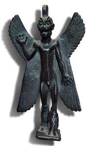 Pazuzu is a demonic god who was well known to the Babylonians and Assyrians throughout the first millennium BCE.[22] He is shown with "a rather canine face with abnormally bulging eyes, a scaly body, a snake-headed penis, the talons of a bird and usually wings".[22] He was believed to be the son of the god Hanbi.[23] He was usually regarded as evil,[22] but he could also sometimes be a beneficent entity who protected against winds bearing pestilence[22] and he was thought to be able to force Lamashtu back to the underworld.[24] Amulets bearing his image were positioned in dwellings to protect infants from Lamashtu[23] and pregnant women frequently wore amulets with his head on them as protection from her.[23]