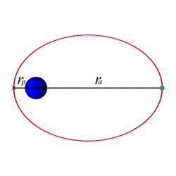 This may be simplified using the elliptical orbit's semi-major axis A and eccentricity e related by the formula