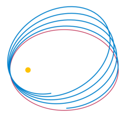 In 1859, Urbain Le Verrier discovered that the orbital precession of the planet Mercury was not quite what it should be; the ellipse of its orbit was rotating (precessing) slightly faster than predicted by the traditional theory of Newtonian gravity, even after all the effects of the other planets had been accounted for.[4] The effect is small (roughly 43 arcseconds of rotation per century), but well above the measurement error (roughly 0.1 arcseconds per century). Le Verrier realized the importance of his discovery immediately, and challenged astronomers and physicists alike to account for it. Several classical explanations were proposed, such as interplanetary dust, unobserved oblateness of the Sun, an undetected moon of Mercury, or a new planet named Vulcan.[5] After these explanations were discounted, some physicists were driven to the more radical hypothesis that Newton's inverse-square law of gravitation was incorrect. For example, some physicists proposed a power law with an exponent that was slightly different from 2.[6]