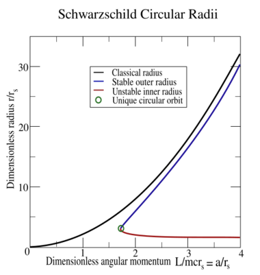 which are obtained using the quadratic formula. The inner radius rinner is unstable, because the attractive third force strengthens much faster than the other two forces when r becomes small; if the particle slips slightly inwards from rinner (where all three forces are in balance), the third force dominates the other two and draws the particle inexorably inwards to r = 0. At the outer radius, however, the circular orbits are stable; the third term is less important and the system behaves more like the non-relativistic Kepler problem.