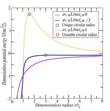 The third term is attractive and dominates at small r values, giving a critical inner radius rinner at which a particle is drawn inexorably inwards to r = 0; this inner radius is a function of the particle's angular momentum per unit mass or, equivalently, the a length-scale defined above.