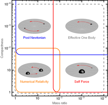Einstein's equations can also be solved on a computer using sophisticated numerical methods.[1][2][3] Given sufficient computer power, such solutions can be more accurate than post-Newtonian solutions. However, such calculations are demanding because the equations must generally be solved in a four-dimensional space. Nevertheless, beginning in the late 1990s, it became possible to solve difficult problems such as the merger of two black holes, which is a very difficult version of the Kepler problem in general relativity.