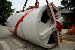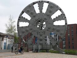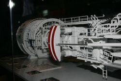 During the late 19th and early 20th century, inventors continued to design, build, and test TBMs for tunnels for railroads, subways, sewers, water supplies, etc. TBMs employing rotating arrays of drills or hammers were patented.[34] TBMs that resembled giant hole saws were proposed.[35] Other TBMs consisted of a rotating drum with metal tines on its outer surface,[36] or a rotating circular plate covered with teeth,[37] or revolving belts covered with metal teeth.[38] However, these TBMs proved expensive, cumbersome, and unable to excavate hard rock; interest in TBMs therefore declined. Nevertheless, TBM development continued in potash and coal mines, where the rock was softer.[39]
